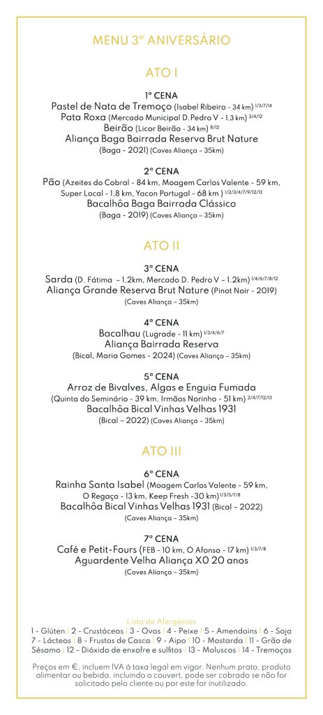 Celebre connosco uma noite única. Apresentamos um menu exclusivo com harmonização de vinhos Cave Aliança, criado para marcar três anos de histórias e sabores à mesa. Lugares limitados — apenas 16 disponíveis. Reserve já a sua experiência gastronómica.